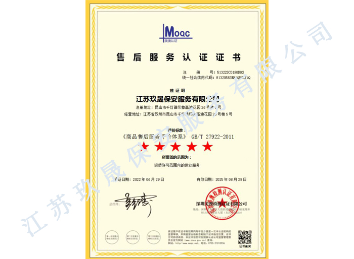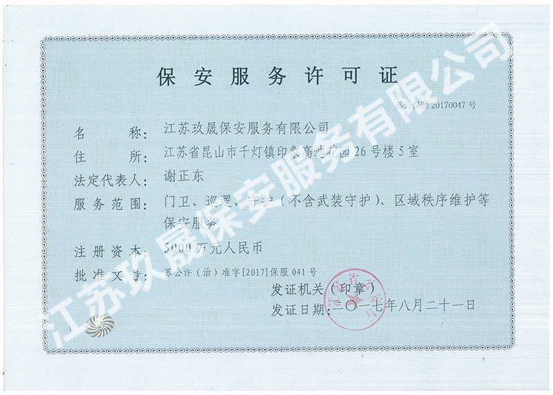 江蘇玖晟保安服務有限公司成立于江蘇省昆山市千燈鎮。注冊資金:5000萬,是擁有省公安廳頒發的保安服務許可證的企業【蘇公保服20170046】,也是昆山市保安協會常務理事單位。